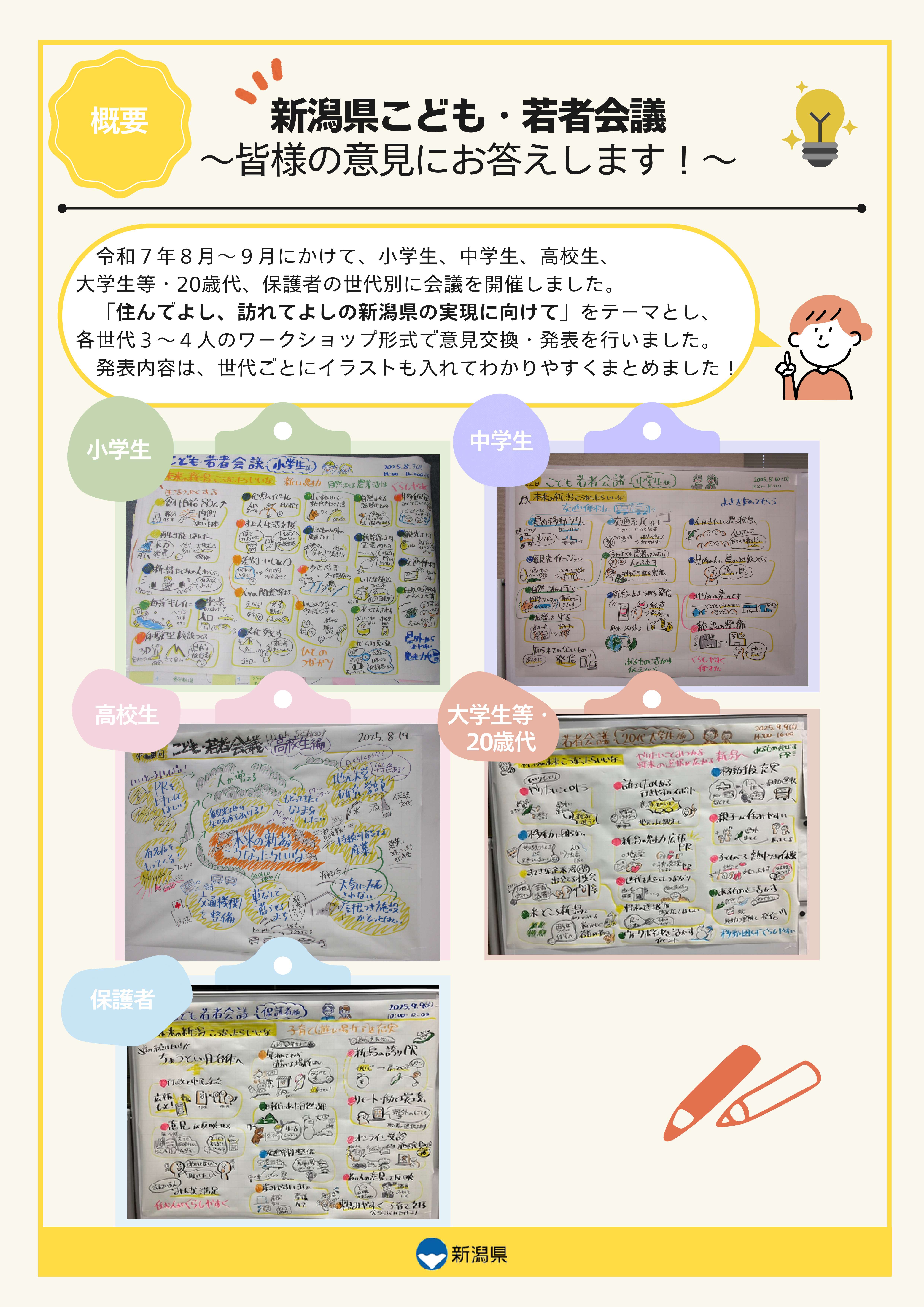新潟県こども計画に基づき、こどもや若者の社会参画と意見反映を進めるため、新潟県のよいところや、未来がこうなったらよいと思うことについて、幅広く意見を聞く。